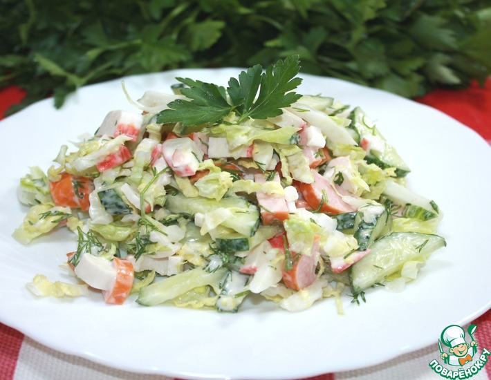 The combination of ingredients in this salad is rather unusual, but in the end, all together it turns out very tasty. If you want to surprise your family, then feel free to prepare this delicious salad. Ingredients for “Chinese cabbage Salad”: Cabbage — 200 g Cucumber — 150 g Crab sticks — 100 g Sausage (smoked) — 100 g Dill Salt Mayonnaise — 2 tbsp Cooking time: 15 minutes Servings: 4 Recipe “Chinese cabbage Salad”: Slice cabbage, cucumbers, crab sticks, sausages, dill. Add salt to taste and season with mayonnaise. Stir and serve. Bon appetit read more