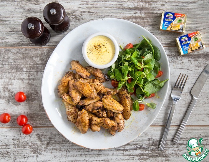 Chicken wings with cheese sauce from Hochland. Ingredients for “Chicken wings with cheese sauce”: Sauce Cheese (“Hochland” “Soup and sauce” for hot dishes) — 100 g Cream (20-30%) — 200 ml Onion — 1 piece Curry — 1 tsp. Salt — to taste Wings Chicken wings — 2 kg Garlic — 5 a tooth. Vegetable oil — 100 ml Salt — 2 tsp. Black pepper — to taste Servings: 8 Recipe “Chicken wings with cheese sauce”: read more